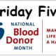 January is National Blood Donor Month – one of the most challenging times of year to collect enough blood and platelet donations to meet patient needs. We’ve dedicated this week’s Friday Five to rallying our readers to roll up their sleeves, give blood, and maybe even save a life or two.